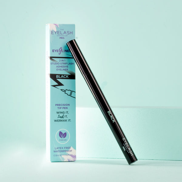 Eyelash Emporium EyeGliner Black is a 2 in 1, strip lash adhesive and precision tip eyeliner pen. Vegan, Latex Free and Waterproof.