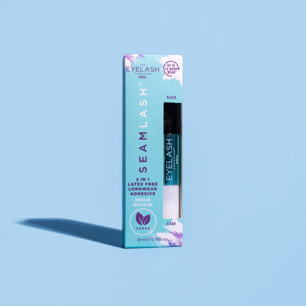 Our SEAMLASH 2 in 1, Latex Free, Longwear Adhesive in a brush-on applicator secures  our SEAMLASH Deconstructed Strip Lash Flicks in place underneath the lash line for a seamless, band less finish and up to 24 hour wear. Our SEAMLASH Clusters and SEAMLASH PRO Applicator are sold separately. Vegan and Latex Free.